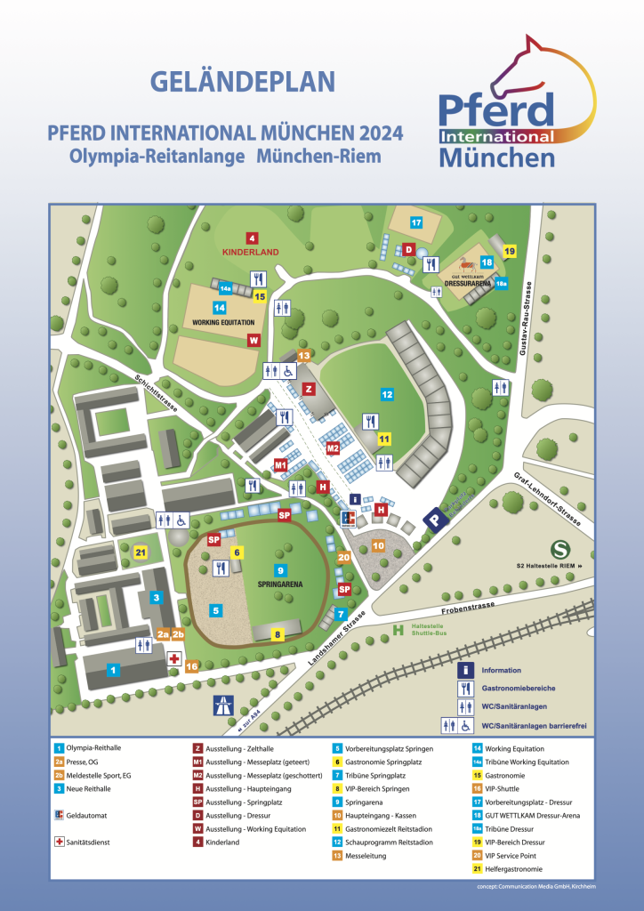 Mit der Bahn: Hauptbahnhof oder Ostbahnhof München S2 Richtung Erding; S-Bahn Station München – Riem, ca. 7 Minuten Fußweg zum Veranstaltungsgelände Olympia-Reitanlage.