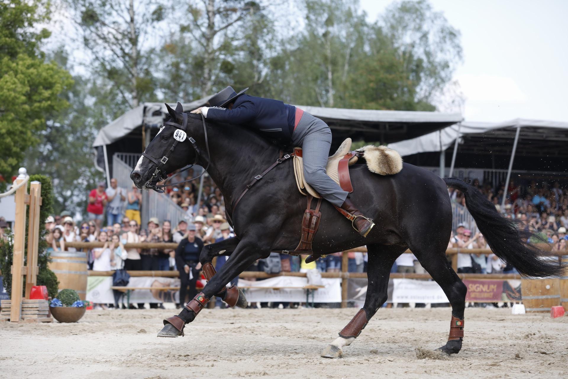 Spannung pur erlebten die Zuschauer heute im Rahmen des Speed Trails der Working Equitation der zugleich die entscheidende letzte Wertungsprüfung für den Einzelweltmeistertitel darstellt. Gilberto Silva und Zinque das Lezirias lieferten einen Ritt, der deutlich unterstrich, warum der Portugiese aktuell in der Working Equitation Szene als unschlagbar gilt: Mit einer Zeit von 107,64 Sekunden verwies er den bis dahin führenden Thomas Türmer mit Orlando auf den zweiten Platz und sicherte sich damit auch den Einzelweltmeistertitel!