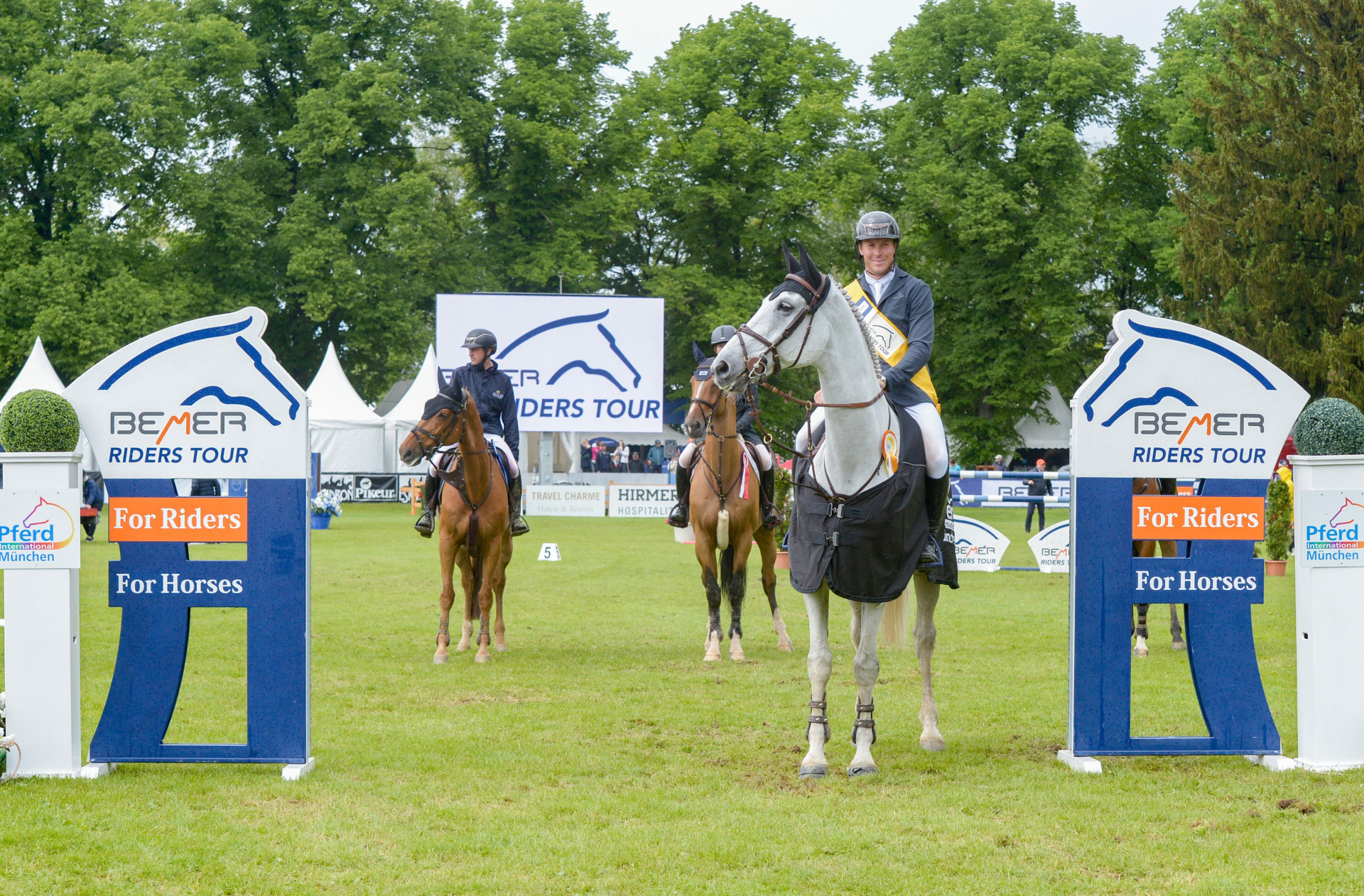 Auch die Springreiter blieben am Nachmittag vom Regen nicht verschont. Und hier zeigte sich der große Hufeisenplatz wieder einmal in seiner ganzen Qualität. „Der Grasboden ist so gut in Schuss, dass da lediglich die obersten ein oder zwei Zentimeter in Mitleidenschaft gezogen werden“, so Turnierleiter Jürgen Blum. So zeigten die Aktiven im Großen Preis von Bayern, der gleichzeitig als Wertungsprüfung der Bemer Riders Tour zählte, Springsport auf Topniveau. Fast fünf Sekunden schneller als alle anderen elf Teilnehmer des zweiten Umlaufs – in der ersten Runde waren es noch über 40 Starter – galoppierte David Will auf seinem erfahrenen 13-jährigen Primus vom Neumühler Hof fehlerfrei durch den Stangenwald des CSI2*-Springens. Das war große Klasse und der Sieg war dem jungen Mann, der am Chiemsee aufgewachsen ist und heute im hessischen Dagobertshausen einen Ausbildungsstall betreibt, nicht mehr zu nehmen. Eine tolle Runde lieferte auch der Augsburger Wolfgang Puschak mit seinem Number One auf Platz zwei, gefolgt von Felix Haßmann aus Lienen mit Carreras.